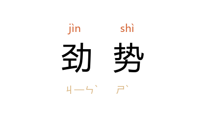 引唐 段成式 《剑侠传·李胜》:“道士起见所卧枕前插一匕首,劲势犹动。”元 范梈 《小孤行》诗:“洪涛万古就绳墨,虽有劲势不敢奔。”清 黄六鸿 《福惠全书·刑名·词讼》:“骋应敌之虚情,压先攻之劲势。”