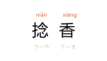 引《敦煌曲子词·苏莫遮五》:“远眺遐方思情悦,或听神鐘感愧捻香爇。”《朱子语类》卷九十:“謁 宣圣 焚香,不是古礼,拜进将捻香,不当叩首。”清 吴骞 《扶风传信录》:“人传昨晨 和桥 地藏殿 有女子随侍女候门启入捻香。”