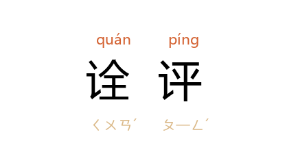 引南朝 梁 刘勰 《文心雕龙·史传》:“然后詮评昭整,苛滥不作矣。”唐 司空图 《题<柳柳州集>后》:“因题 柳 集之末,庶裨后之詮评者,无或偏説以盖其全工。”