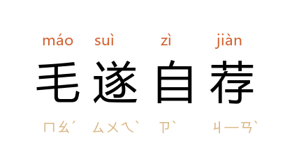 引《史记·卷七六·平原君虞卿传》。后比喻自告奋勇,自我推荐。《儿女英雄传·第一八回》:「为此晚生不揣鄙陋,竟学那毛遂自荐,倘大人看我可为公子之师,情愿附骥。」