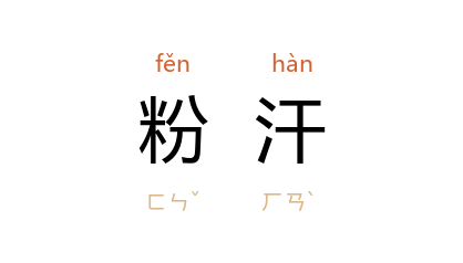 ⒈ 指妇女之汗。妇女面多敷粉,故云。