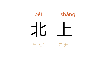 ⒈ 传统的方位观念以上为北,下为南,所以向北出发称为「北上」。