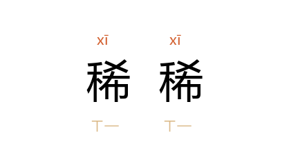 引汉 黄宪 《天禄阁外史·时势》:“不知旬日之内,其叶稀稀,其木濯濯,向也扶疎而成阴,今则頽然而无叶矣。”洪深 《香稻米》第一幕:“姜老爷 是个‘官而商者也’;他的相貌,似乎也是‘官而商者也’!稀稀几根黄胡子,岂不像‘官’?”巴金 《将军集·一件小事》:“他站在父亲的身边,面前是两个箩筐,里面装了好几颗白菜和一堆番茄,每一样稀稀的装不满半个箩筐。”