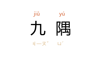 引《逸周书·尝麦》:“蚩尤 乃逐帝,争于 涿鹿 之河,九隅无遗。”《楚辞·王褒<九怀·匡机>》:“弥览兮九隅,彷徨兮兰宫。”王逸 注:“歷观九州求英俊也。”唐 李邕 《秦望山法华寺碑》:“百宝盈於九隅,羣经备於三藏。”