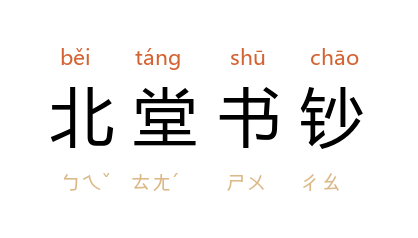 ⒈ 书名。唐虞世南撰。分八百零一类,一百六十卷。因虞氏在隋为秘书郎,北堂为秘书省的后堂,故称为「北堂书钞」。书中分类摘钞字句,而不尽注出处,原本为明陈禹谟所窜改,已非本来面目,然所引多古书,考证家多援以为据。