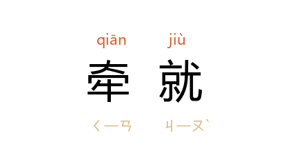 引《元史·郭守敬传》:“今新仪皆细刻周天度分,每度为三十六分,以距线代管窥,宿度餘分并依实测,不以私意牵就。”清 朱克敬 《瞑庵杂识》卷一:“又用人之际,诸多牵就,啗以所欲,始得其力。”鲁迅 《华盖集·通讯二》:“况且撰人一多,则因为希图保持内容的较为一致起见,即不免有互相牵就之处。”