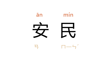 ⒉ 人名。生卒年不详。宋长安石工,熙宁间,蔡京书元祐党人碑,颁定州县刻于石上,安民被征役参与其事,因乞免镌本人姓名于碑末,时人以为义。