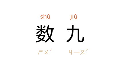 ⒈ 俗称冬至后九九八十一天后方春风送暖,寒意全消。故自冬至起称为「数九」。