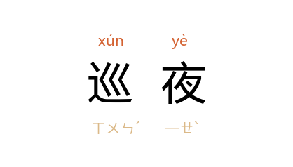 引南朝 梁 戴暠 《从军行》:“督军鸣战鼓,巡夜数更鞞。”元 无名氏 《杀狗劝夫》第二折:“见哥哥迎着风冒着雪,倒在当街睡。我只怕鐘声尽,被那巡夜的凌逼。”巴金 《灭亡》第十五章:“这时候别人睡在温暖的被窝里多么写意!他们倒冷清清的,在这荒凉的街道上巡夜。”