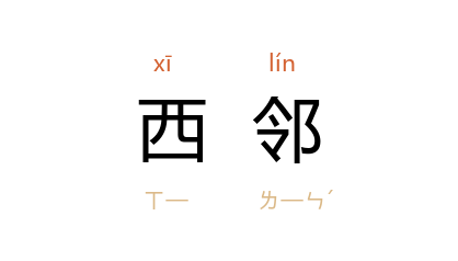 引《易经·既济·九五》:「东邻杀牛,不如西邻之禴祭,实受其福。」《文选·王粲·赠文叔良诗》:「君子于征,爰聘西邻。」