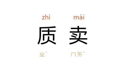 引《资治通鉴·唐宪宗元和四年》:“魏徵 玄孙 稠 贫甚,以故第质钱於人……出内库钱二千緡赎赐 魏稠,仍禁质卖。”《明史·食货志一》:“凡质卖田土,备书税粮科则,官为籍记之,毋令产去税存以为民害。”清 朱仕琇 《太学生陈君墓志铭》:“岁饥,家乏粟,出财转穀於外以赡族,至质卖世业以济行。”