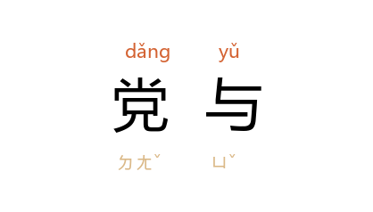 引《公羊传·宣公十一年》:“纳 公孙宁、仪行父 于 陈。此皆大夫也,其言纳何?纳公党与也。”《新唐书·张廷珪传》:“张易之 诛,议穷治党与。”邹鲁 《云南光复》:“哥老会首 余占标,不密其事,为 滇 吏侦知,被获梟首,党与遂散。”