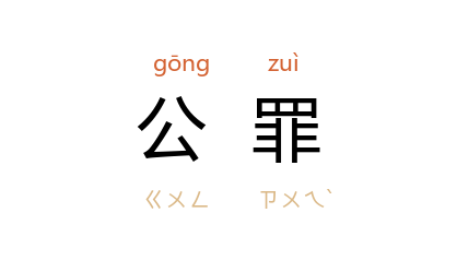 引《宋史·真宗纪三》:“﹝ 大中祥符 四年﹞二月庚戌,詔贡举人公罪听赎。”《明律·名例·犯罪得累减》:“凡一人犯罪,应减者,若为从减,自首减,故失减,公罪递减之类,并得累减。”《清会典·刑部·刑部尚书》“凡民罹於辟者,罪有公私”原注:“内外文武官员,犯公罪,应笞一十者,罚俸一月。”
