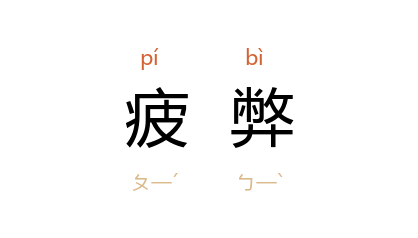 引《五代史平话·唐史·卷上》:「使不得休息,乘其疲弊,可一举而灭之也。」《三国演义·第二三回》:「兵起连年,百姓疲弊,仓廪无积,不可复兴大军。」