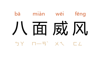 亦省作“八面威”。 明 陈汝元 《金莲记·释愤》:“只趁俺将军八面威,呀,教他们狭路难相逢。”
