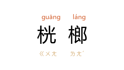 ⒈ 亦作“桄桹”。木名。俗称砂糖椰子、糖树。一种马来亚的羽叶棕榈( Arenga pinnata ),叶大,基部密被纤维,产生一种甜液,制造椰子糖和棕榈酒,其髓生产西谷淀粉。