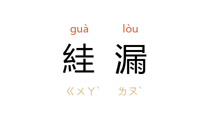 引语本 唐 韩愈 《南山》诗:“团辞试提挈,挂一念万漏。”明 沉德符 《野获编·科场三·两中乡试》:“余再三繙閲,始得之,其他絓漏必尚多也。”清 钱大昕 《廿二史考异·隋书二·经籍志二》:“然史臣自言於旧録之外,更有附入,则有附有否,难辞絓漏之咎矣。”