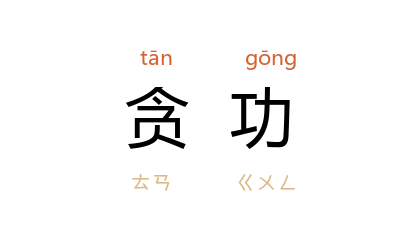 引唐 薛用弱 《集异记·奚乐山》:“主人讶其贪功,笑指一室曰:‘此有六百斤,可任意施为。’”宋 周密 《齐东野语·端平入洛》:“后世以成败论功名,遂以贪功冒进罪之,恐亦非至公之论也。”清 赵翼 《瓯北诗话·杜少陵诗》:“哥舒翰,武夫也, 高适 为其掌书记。 杜 送 高 诗:‘请君问主将,安用穷荒为?’是固已薄 翰 之贪功邀宠矣。”