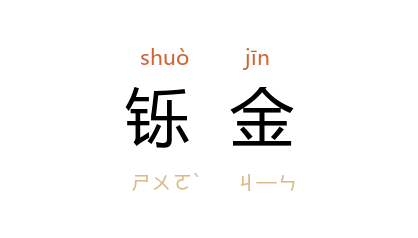 ⒈ 熔化金属。《周礼·考工记序》:“铄金以为刃,凝土以为器。”亦指熔化的金属。《韩非子·五蠹》:“布帛寻常,庸人不释;铄金百溢,盗跖不掇。不必害,则不释寻常;必害手,则不掇百溢。”陈奇猷集释:“《说文》:'铄,销金也。'案正在销之金,温度甚高,故盗跖不取。”汉桓寛《盐铁论·诏圣》:“夫铄金在炉,庄蹺不顾;钱刀在路,匹妇掇之。”一说指精美的金子。