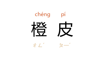 ⒈ 柳橙的果皮。可入药,芳香性苦,除健胃外,更可用作调味及矫臭剂。