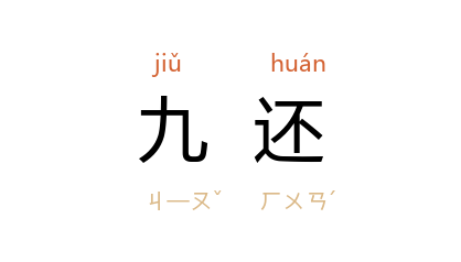引唐 吕岩 《七言诗》之二四:“九转九还功若就,定将衰老返长春。”元 李好古 《张生煮海》第一折:“七返九还,以成大罗神仙。”《初刻拍案惊奇》卷十八:“而今九还之期已过,丹已成了,正好开看。”
