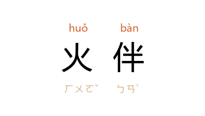 ⒈ 古代兵制,十人为火,同于一灶起火作饭,故称同火的人为「火伴」。后来泛指同伴。也作「伙伴」。