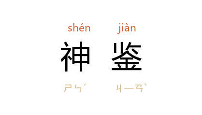 引晋 葛洪 《抱朴子·审举》:“人君虽明并日月,神鉴未兆,然万机不可以独统,曲碎不可以亲总,必假目以遐览,借耳以广听。”南朝 宋 慧通 《驳顾道士夷夏论》:“然则圣人神鉴,靡所不通,智照寧有不周?”唐 玄奘 《大唐西域记·奔那伐弹那国》:“神鑑无隐,灵应有徵。”