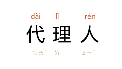 ⒈ 依法律规定或委任契约,而代理他人为法律行为者。若因法律规定而代理者,称为「法定代理人」,因委任契约而代理者,称为「意定代理人」。