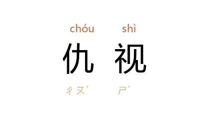 ⒉ 以仇恨的心理或目光看。