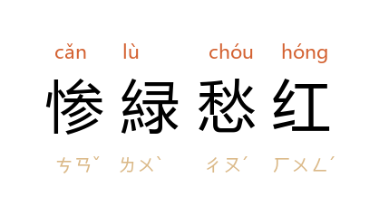 ⒈ 经风雨摧残的落花败叶。宋·柳永〈定风波·自春来〉词:「自春来、渗绿愁红,芳心是事可可。」宋·张孝祥〈减字木兰花·枷花搦柳〉词:「惨绿愁红,憔悴都因一夜风。」也作「愁红惨绿」。
