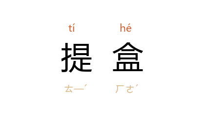 ⒈ 有提把的盒子,多为两层或三层,形状不一,用竹、木、金属或搪瓷等制成。可用来盛装饭菜、糕点等。