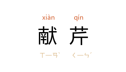 ⒈ 《列子·杨朱》:“宋国有田夫……谓其妻曰:‘负日之暄,人莫知者,以献吾君,将有重赏。’里之富告之曰:‘昔人有美戎菽、甘枲茎芹萍子者,对乡豪称之。乡豪取而尝之,蜇于口,惨于腹,众哂而怨之,其人大惭。’”后遂以“献芹”谦言自己赠品菲薄或建议浅陋。
