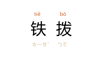 引唐 段安节 《乐府杂录·琵琶》:“开元 中有 贺怀智,其乐器以石为槽,鵾鸡筋作絃,用铁拨弹之。”宋 苏轼 《杜介熙熙堂》诗:“遥想闭门投辖饮,鵾絃铁拨响如雷。”元 张宪 《良宵》诗:“铁拨顿敲壶口破,金刀频剪烛心齐。”
