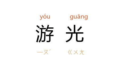 ⒉ 传说中的恶鬼名。《文选·张衡〈东京赋〉》:“殪野仲而歼游光。”薛综注:“野仲、游光,恶鬼也。”汉马融《广成颂》:“捎罔两,拂游光。”《三国志·魏志·夏侯玄传》“丰不知而往,即杀之”裴松之注引三国魏鱼豢《魏略》:“时有谤书曰:'曹爽之势热如汤,太傅父子冷如浆,李丰兄弟如游光。'”清唐孙华《逐疫鬼》诗:“游光及野仲,次第行天诛。”一说为火神名。参阅《广雅·释天》。