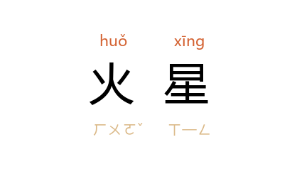 ⒈ 行星名。距离太阳第四近的行星,有两颗小卫星。属于类地行星,外观呈现红棕色,大气稀薄。表面的奥林帕斯山是太阳系的最高山峰。古称「荧惑」。