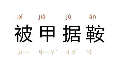⒈ 汉马援年六十二,请出征,光武帝以其老,未许。“援自请曰:'臣尚能被甲上马。'帝令试之。援据鞍顾眄,以示可用。帝笑曰:'矍铄哉是翁也!'”事见《后汉书·马援传》。后因以“被甲据鞍”形容武将年虽老而壮志不减。