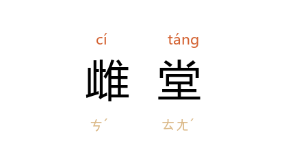 引宋 黄朝英 《靖康缃素杂记·黄阁》:“黄堂者,太守听事之堂也,亦谓之雌堂……﹝ 宋子京 ﹞《初到郡斋》云:‘姑俟天藏疾,雌堂日宴居。’”