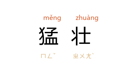 引《三国志·吴志·孙坚传》:“卓 惮 坚 猛壮,乃遣将军 李傕 等来求和亲。”元 刘唐卿 《降桑椹》第三折:“吾神形容猛壮,性烈刚强。”萧红 《生死场》十五:“他们的衣装和步伐看起来不像一个队伍,但衣服下藏着猛壮的心。”