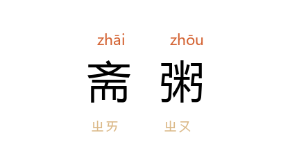引宋 朱熹 《游昼寒以茂林修竹清流激湍分韵赋诗得竹字》:“我生虽已后,久此寄斋粥。”金 元好问 《寄汴禅师》诗:“斋粥空疎想君瘦,冠巾收歛定谁公。”清 赵翼 《寓西湖十日杂记游迹》诗:“斋粥僧千指,香钱岁万金。”