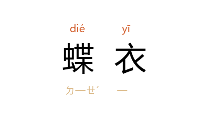 ⒈ 蝴蝶的翅膀。宋·张耒〈夏日〉诗三首之一:「蝶衣晒粉花枝午,蛛网添丝屋角晴。」也作「蝶翎」、「蝶翅」。