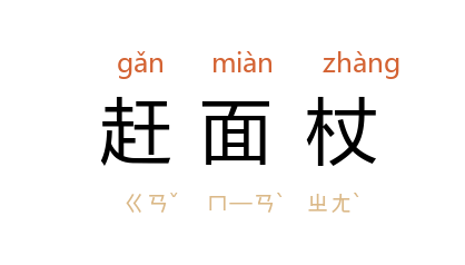 引《元典章·刑部·打死换作病死》:“田云童 於正月初二日将弟 田二 用赶麪杖肯打。”《西游记》第四九回:“妖邪道:‘你不是磨博士,怎么会使赶麪杖。’”亦作“赶麵杖”。 老舍 《骆驼祥子》十七:“两个孩子急了,一个拿起煤铲,一个抄起赶面杖,和爸爸拚了命。”