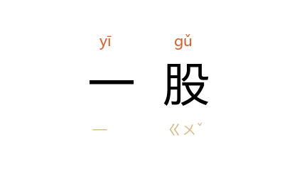 ⒈ 表数量。用于条状物。物由两条以上合成者,称其一条为一股。表数量。指一支。表数量。用于气味、力气、神态、风气等。犹言一齐,一股脑儿。表数量。用于水流、气流、道路等。表数量。用于成批的人。如:一股土匪;一股敌军。