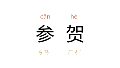 引《旧唐书·穆宗纪》:“其日,百僚、命妇宜於 光顺门 进名参贺。”《宋史·职官志二》:“皇太子正席,讲读官迭起如 延英 仪,讲罢復位。节朔不受宫僚参贺。”《水浒传》第六回:“等他来时,诱他去粪窖边,只做参贺他,双手抢住脚,翻筋斗,攧那厮下粪窖去,只是小耍他。”