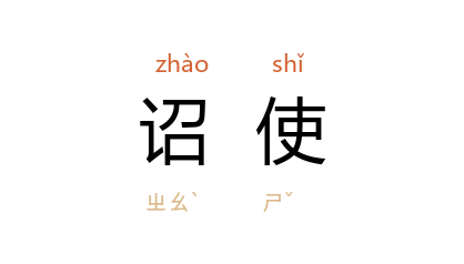 引《晋书·刘暾传》:“敢因 刘舆 拒扞詔使,私欲大府兴长狱讼。”《新唐书·崔戎传》:“时詔使尚在,民泣诣使,请白天子丐 戎 还,使许诺。”元 黄溍 《嗣天师祷雪有应诸公咸为作诗邀予同赋》:“万人举首望 蓬莱,詔使函香出上台。”清 黄六鸿 《福惠全书·典礼·救护日月》:“故处通衢,于詔使往来之际,除明探之外,尤宜另拨潜探,庶无失悮。”