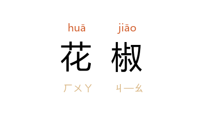 ⒈ 植物名。芸香科花椒属,落叶灌木或小乔木。高三~六公尺,叶为羽状复叶,花开于六、七月,为无梗的繖房花序。果实红色,九、十月成实,种子黑色。实与茎的外皮皆为香料,中医上有散寒、燥湿、下气、温中,促进食欲的效果。