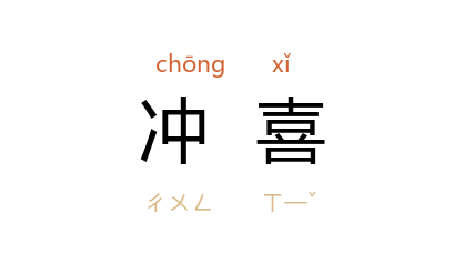 ⒈ 亦作“冲喜”。旧时迷信风俗。在人病重时,用办理喜事来驱除所谓的邪祟,想借此化凶为吉。