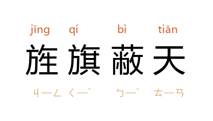 引《武林旧事·卷二·御教》:「戈甲耀日,旌旗蔽天,连亘二十余里,粲如锦绣。」《英烈传·第四四回》:「因率城中将士,鼓噪而出,声震山谷,旌旗蔽天,莫不以一当百,斩首万级数。」