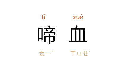 ⒈ 传说杜鹃总要啼到口里出血才止,所以用“啼血”指杜鹃啼得悲苦。