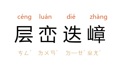 - 层峦迭嶂:峦:山峰;嶂:直立像屏障的山;层、叠:重复,一层加上一层。形容山峰起伏,连绵重叠。