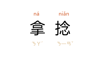 引元·白朴《墙头马上·第三折》:「心似醉意如呆,眼似瞎手如瘸,轻拈掇慢拿捻。」